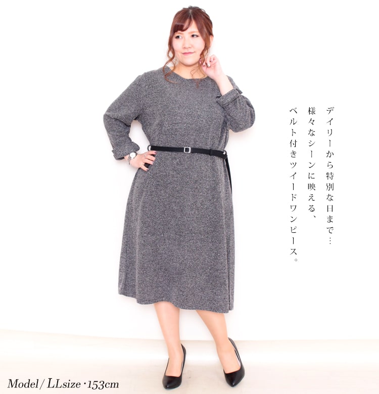 大きいサイズ レディース ワンピース ベルト付きツイードワンピース ワンピ 膝丈 長袖 ツイード クルーネック ベルト スリット バックボタン 柄 フレア 卒園 卒業式 入園 入学式 高級感 春新作 春服 秋服 LL 2L 3L 4L 5L ブラック 黒 アイボリー ネイビー 韓国ファッション