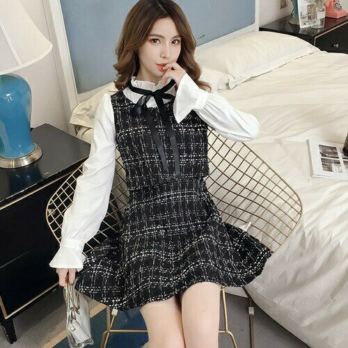 ツイードワンピース レディース グレンチェック ワンピース長袖 リボン フリル ツイード フレア